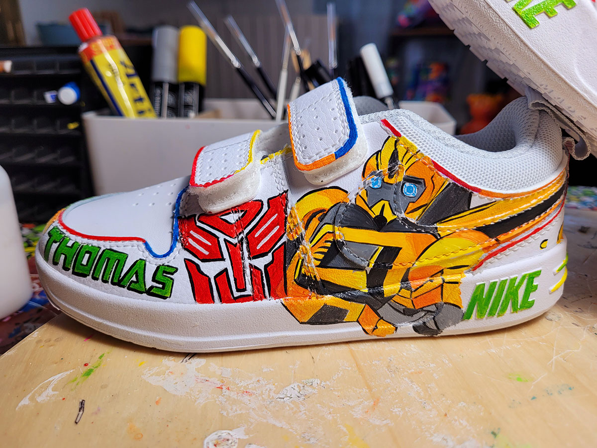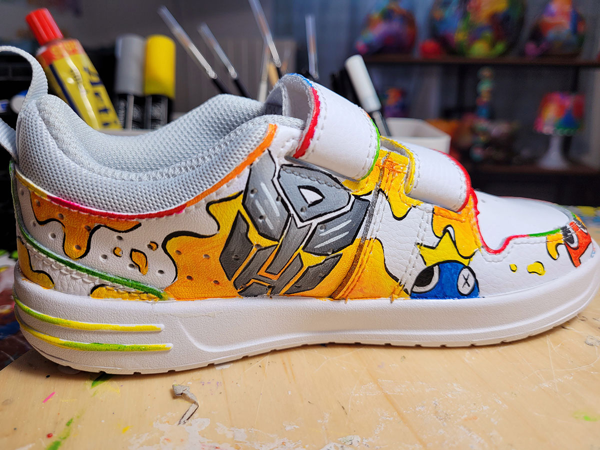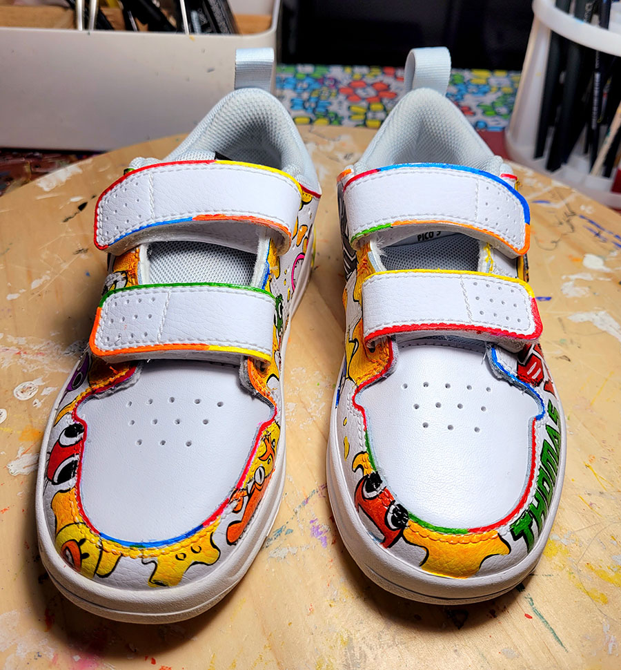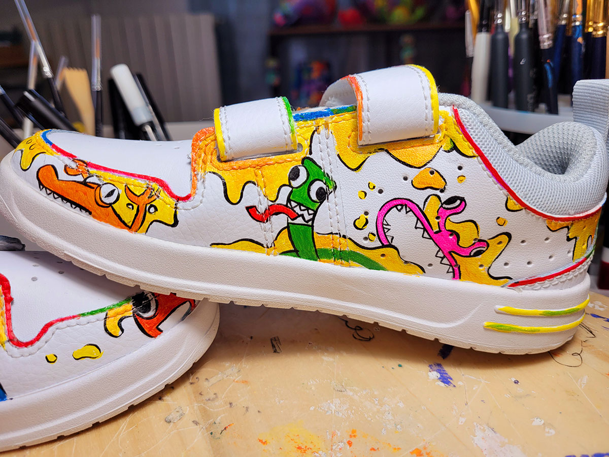 Scarpe dipinte interamente a mano con prodotti appositi per pelle e tessuto, trattate con differenti strati di protettivi che le rendono durevoli nel tempo.