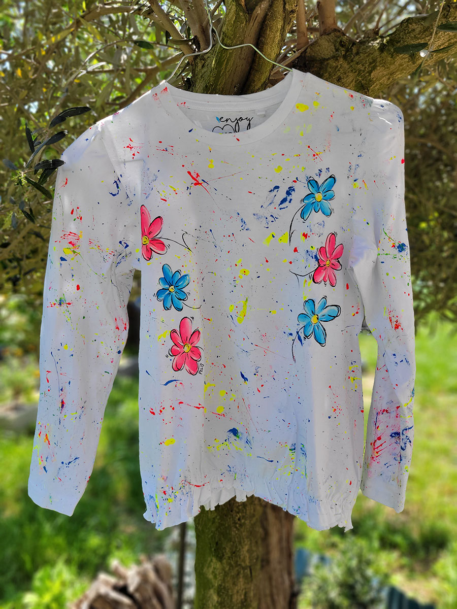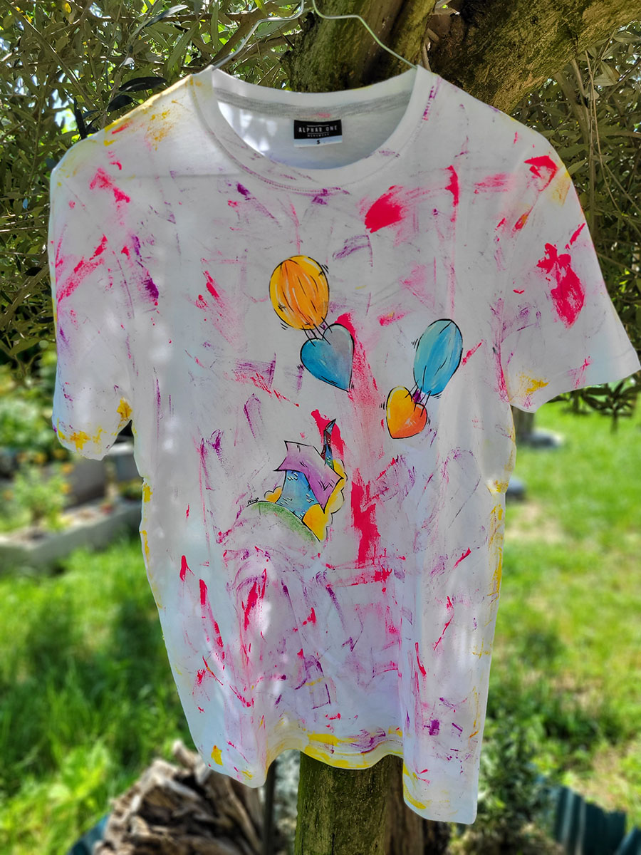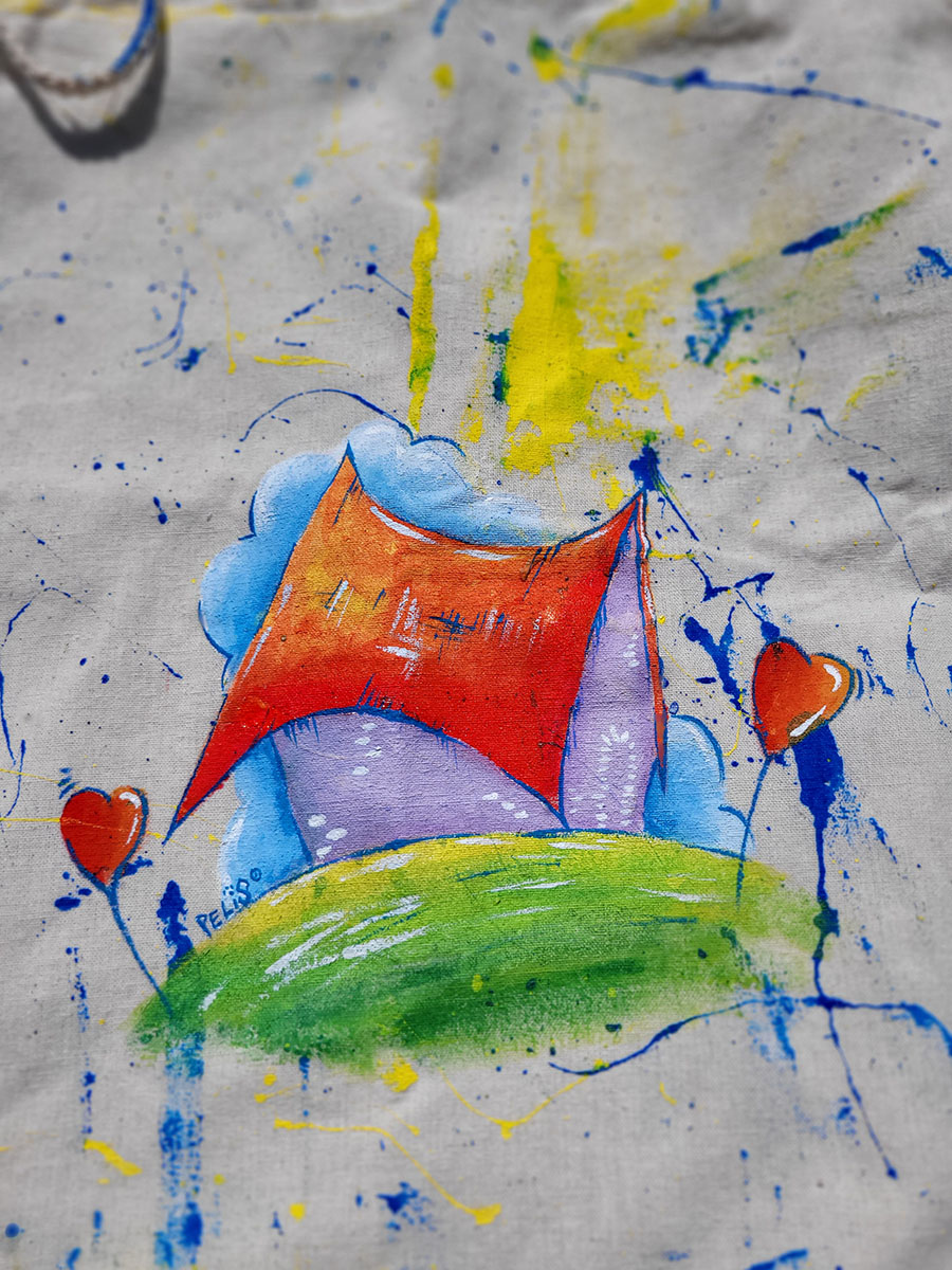 Sacca in tela dipinta a mano con colori appositi per tessuti e trattamento finale protettivo.