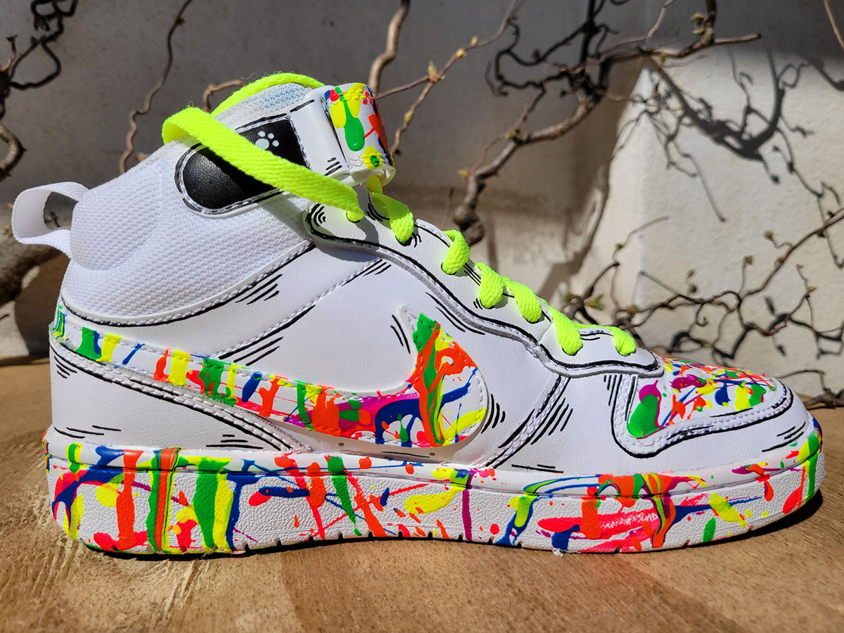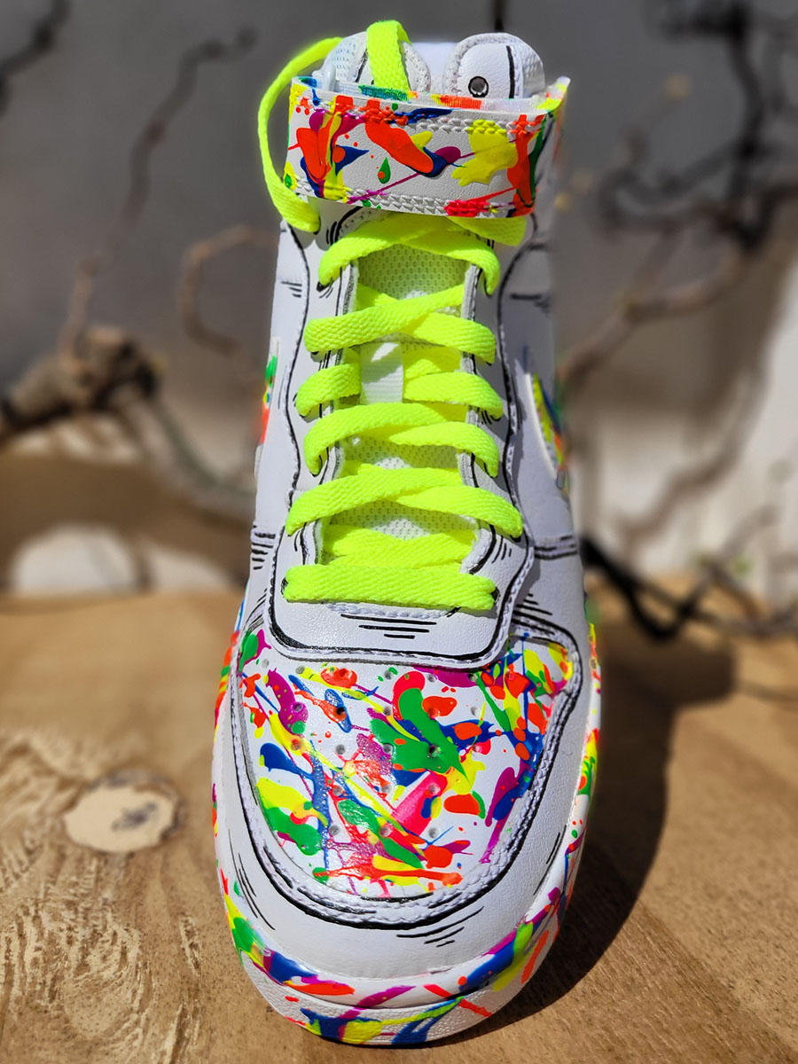 Scarpe dipinte interamente a mano con prodotti appositi per pelle e tessuto, trattate con differenti strati di protettivi che le rendono durevoli nel tempo.
