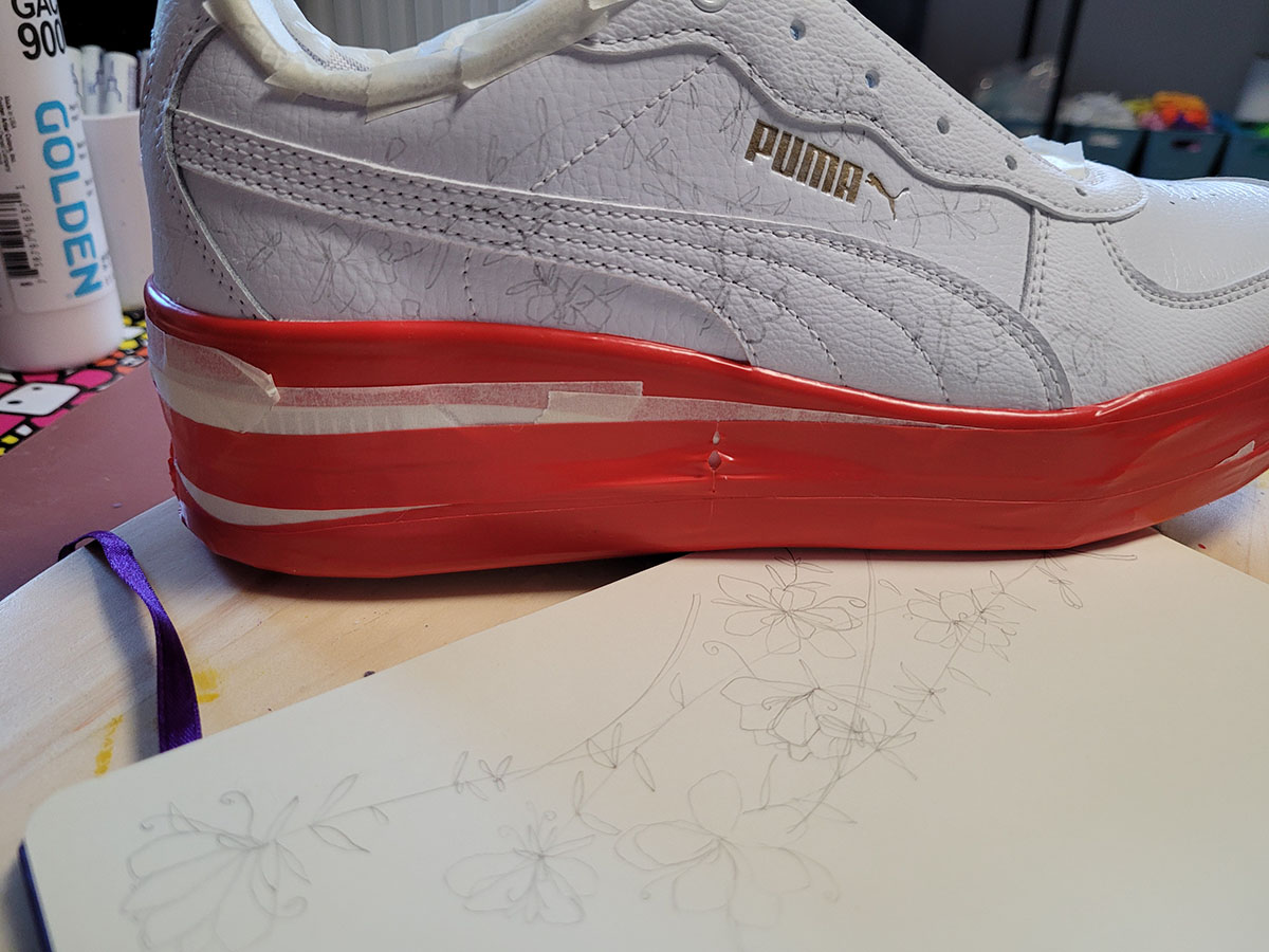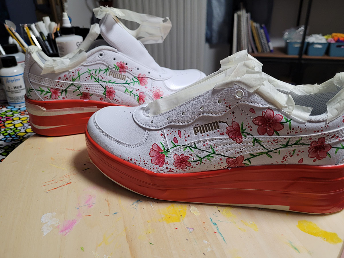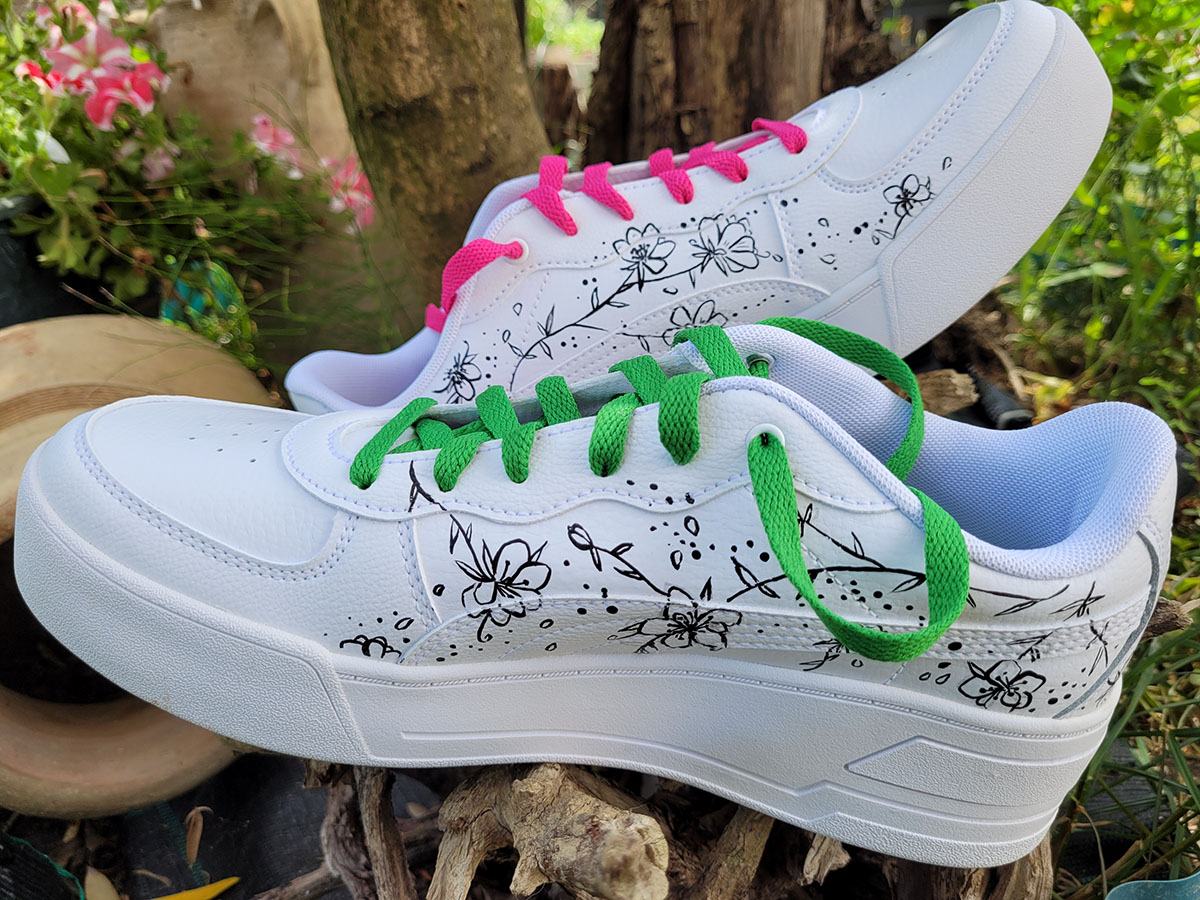 Scarpe dipinte interamente a mano con prodotti appositi per pelle e tessuto, trattate con differenti strati di protettivi che le rendono durevoli nel tempo.