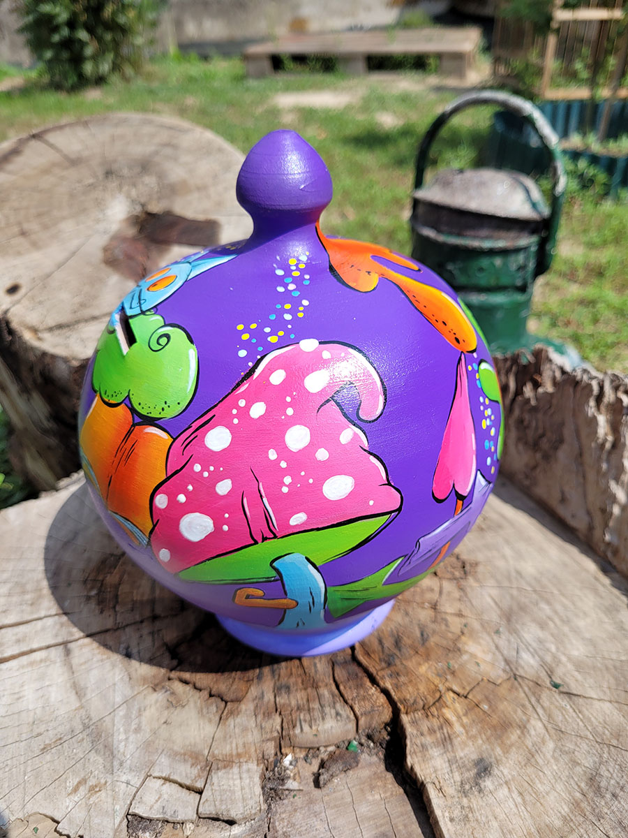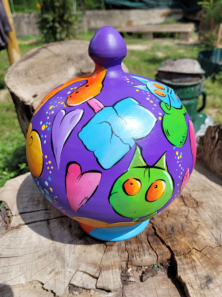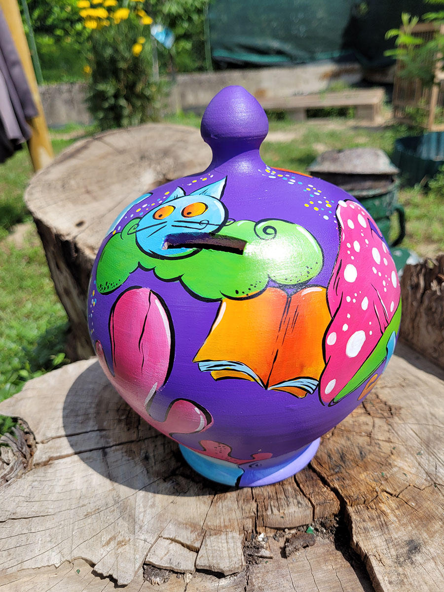 Salvadanaio trattato con appostiti fondi aggrappanti che permettono l’adesione del colore, dipinto con vivaci prodotti duraturi e protetto con tre strati di differenti prodotti che lo rendono durevole nel tempo.