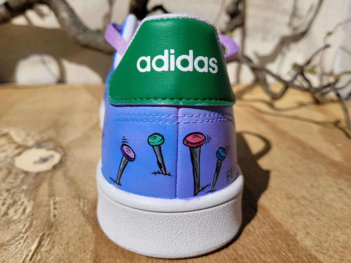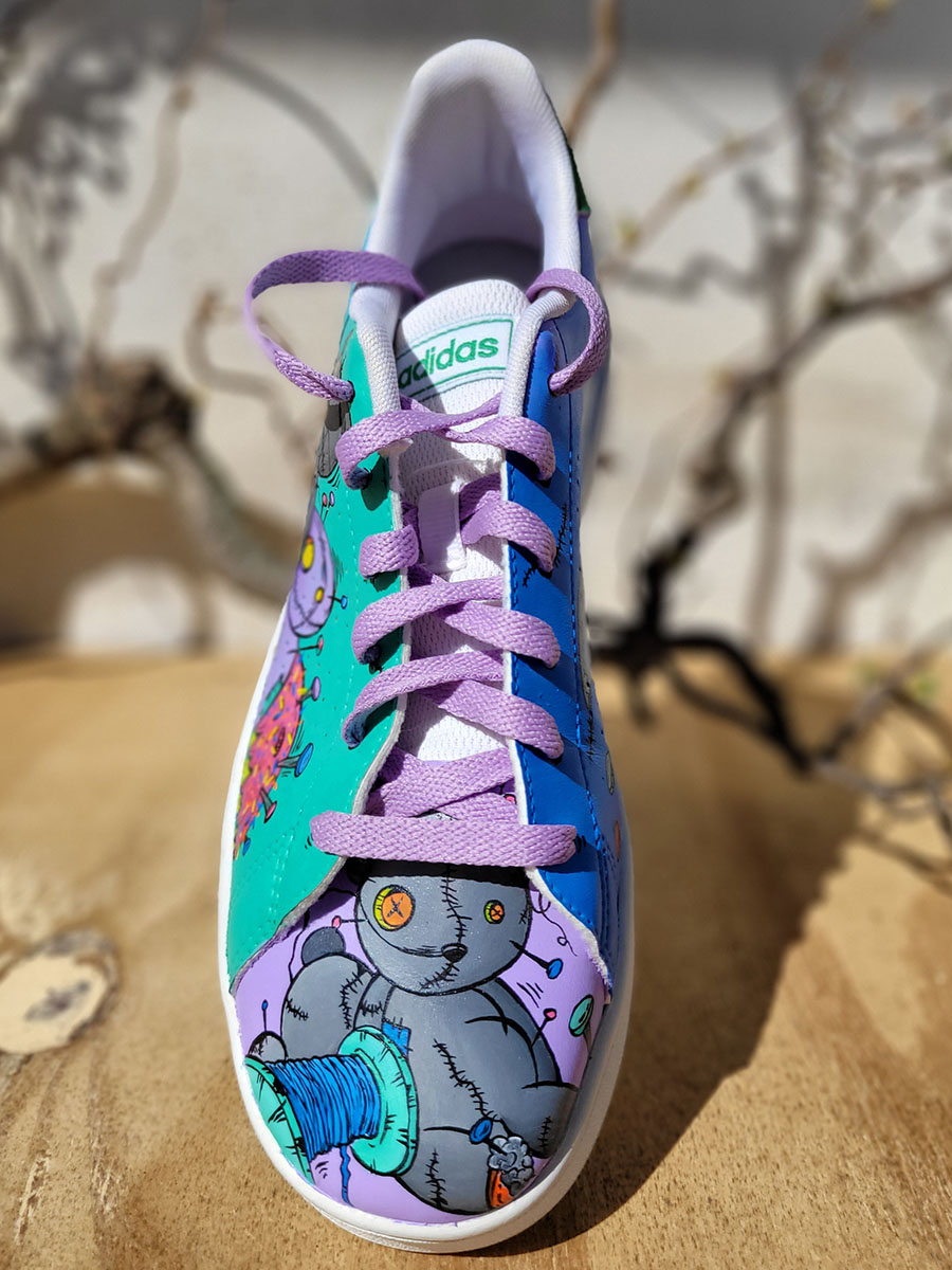 Scarpe dipinte interamente a mano con prodotti appositi per pelle e tessuto, trattate con differenti strati di protettivi che le rendono durevoli nel tempo.