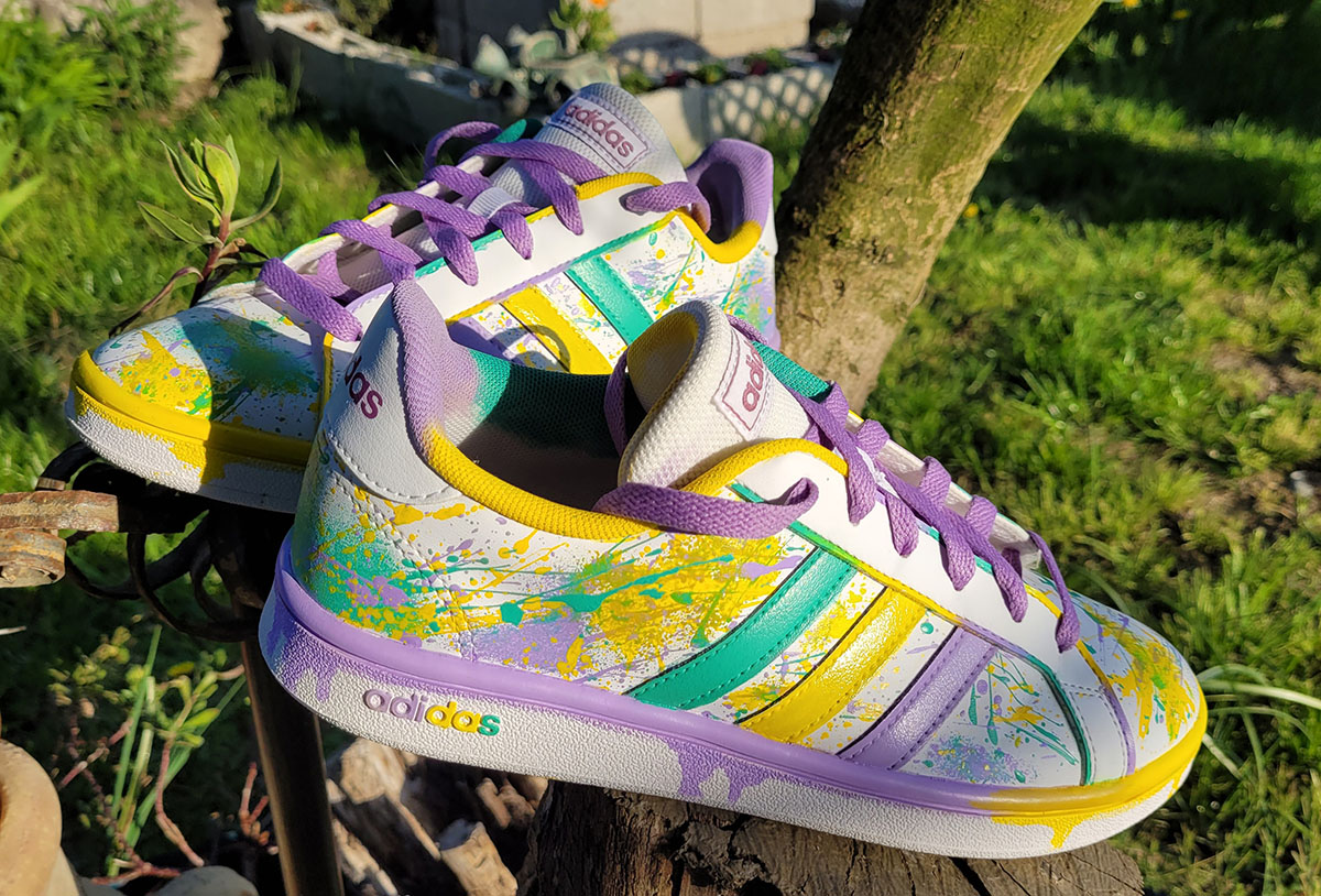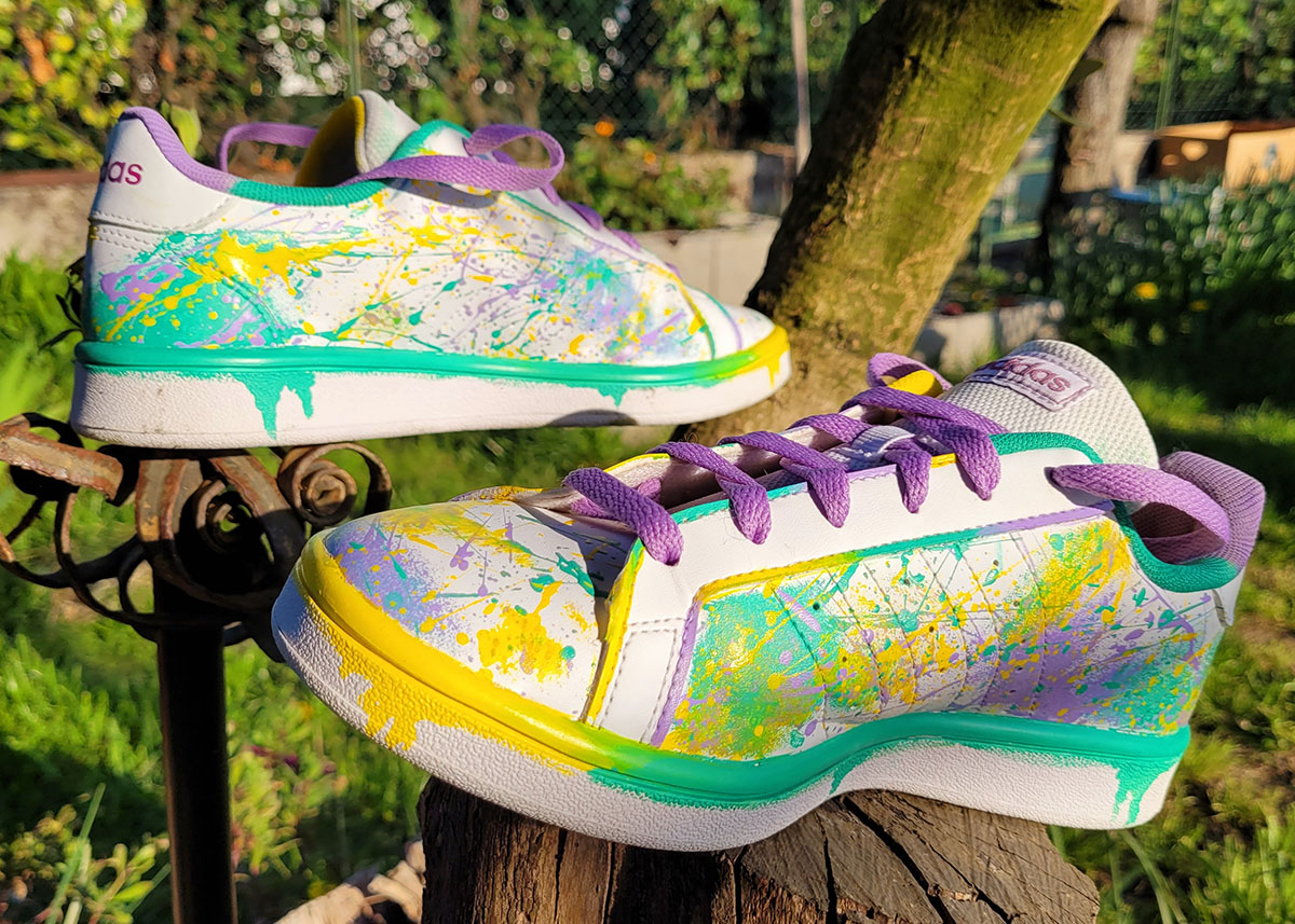 Scarpe dipinte interamente a mano con prodotti appositi per pelle e tessuto, trattate con differenti strati di protettivi che le rendono durevoli nel tempo.