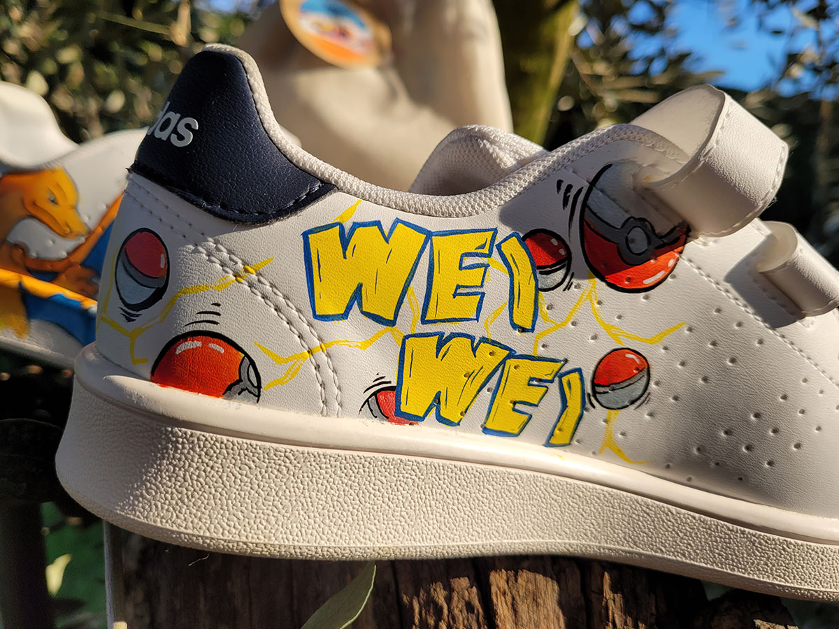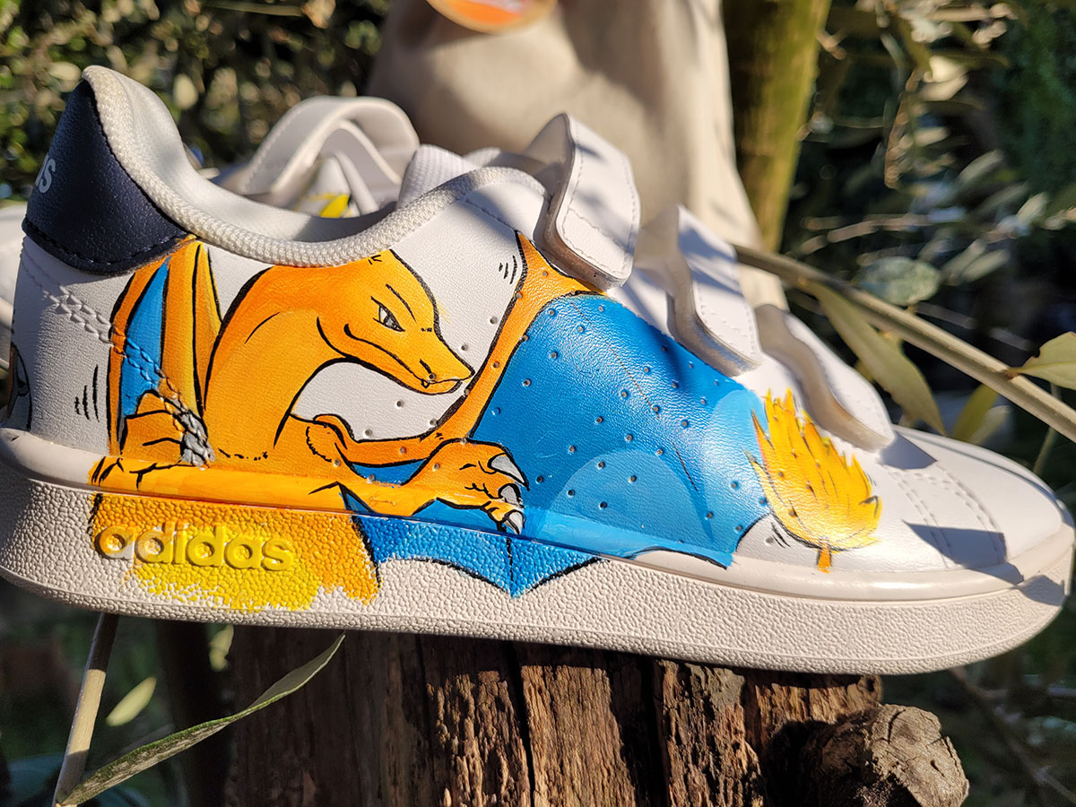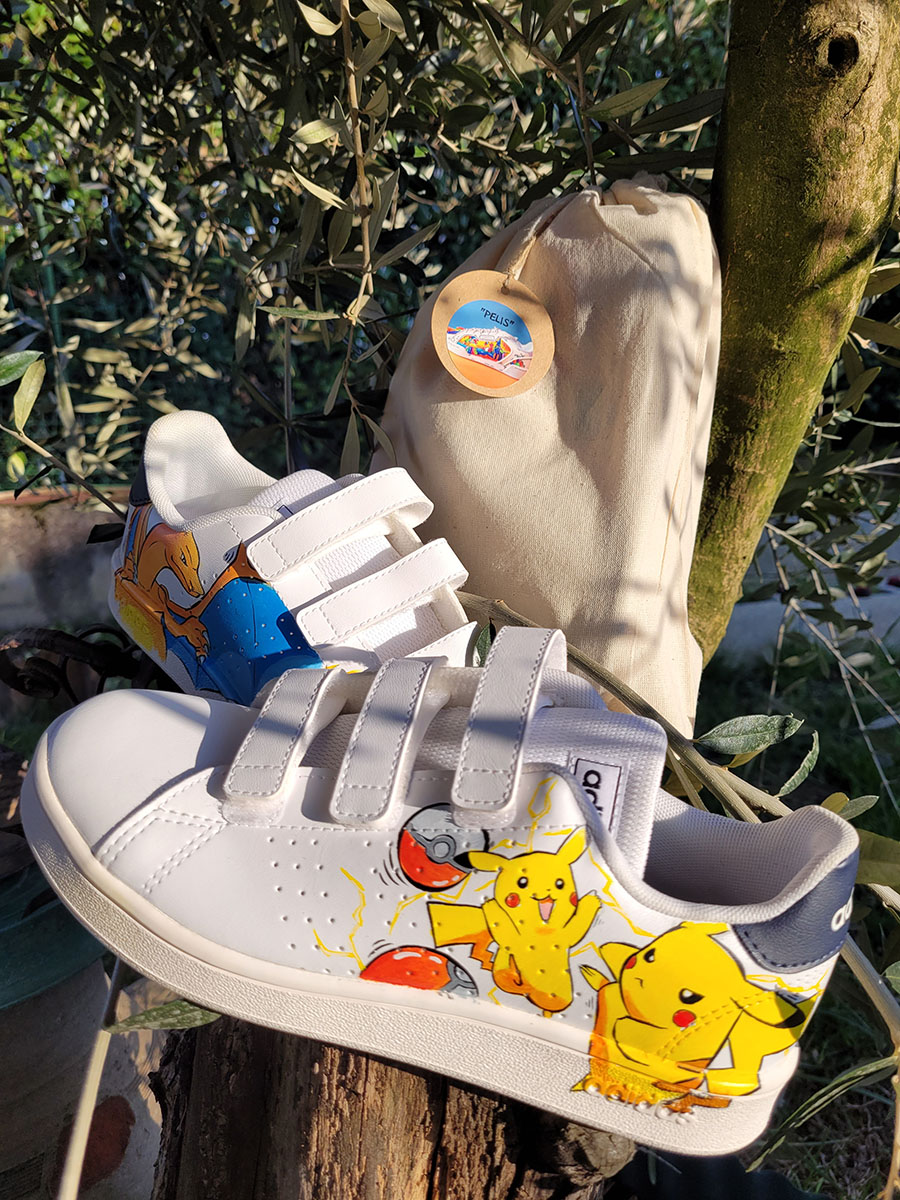 Scarpe dipinte interamente a mano con prodotti appositi per pelle e tessuto, trattate con differenti strati di protettivi che le rendono durevoli nel tempo.
