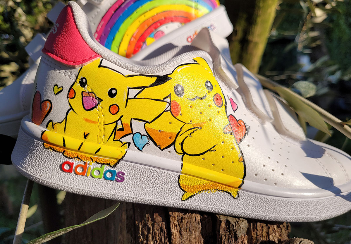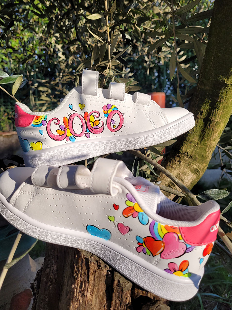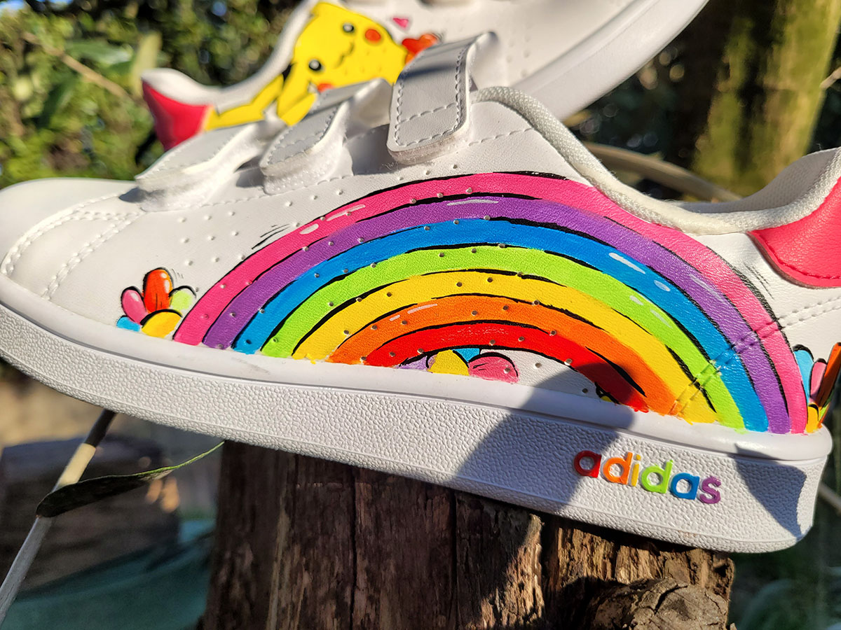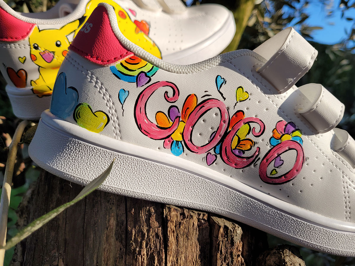 Scarpe dipinte interamente a mano con prodotti appositi per pelle e tessuto, trattate con differenti strati di protettivi che le rendono durevoli nel tempo.