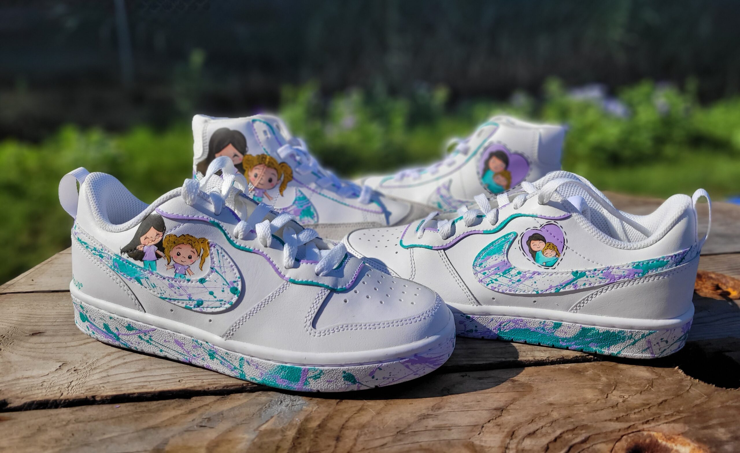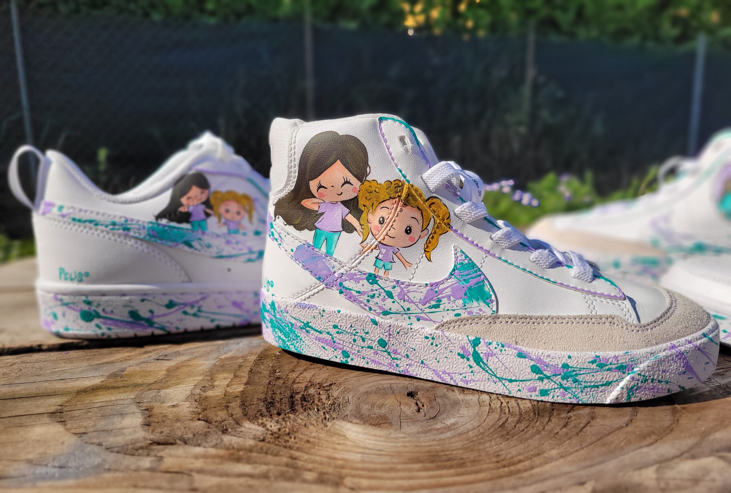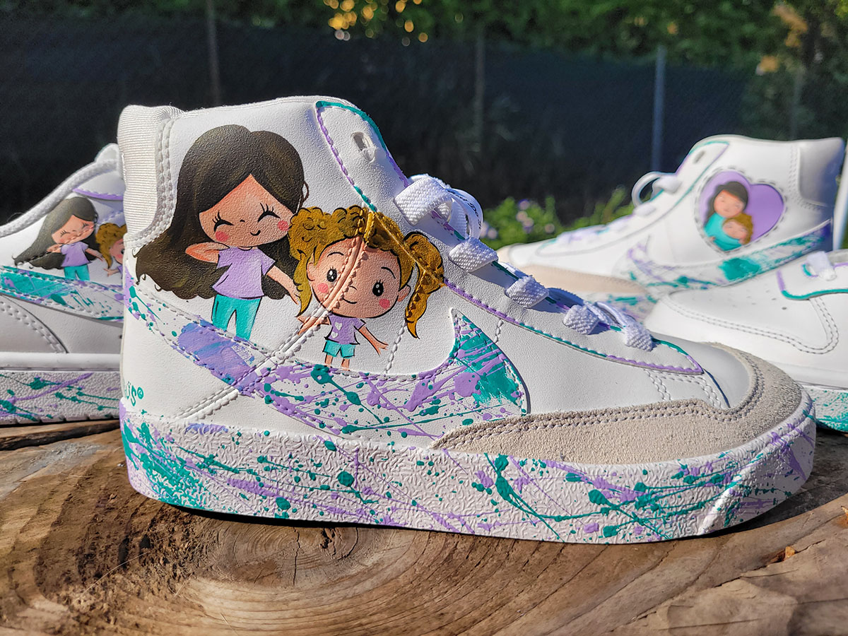 Scarpe dipinte interamente a mano con prodotti appositi per pelle e tessuto, trattate con differenti strati di protettivi che le rendono durevoli nel tempo.