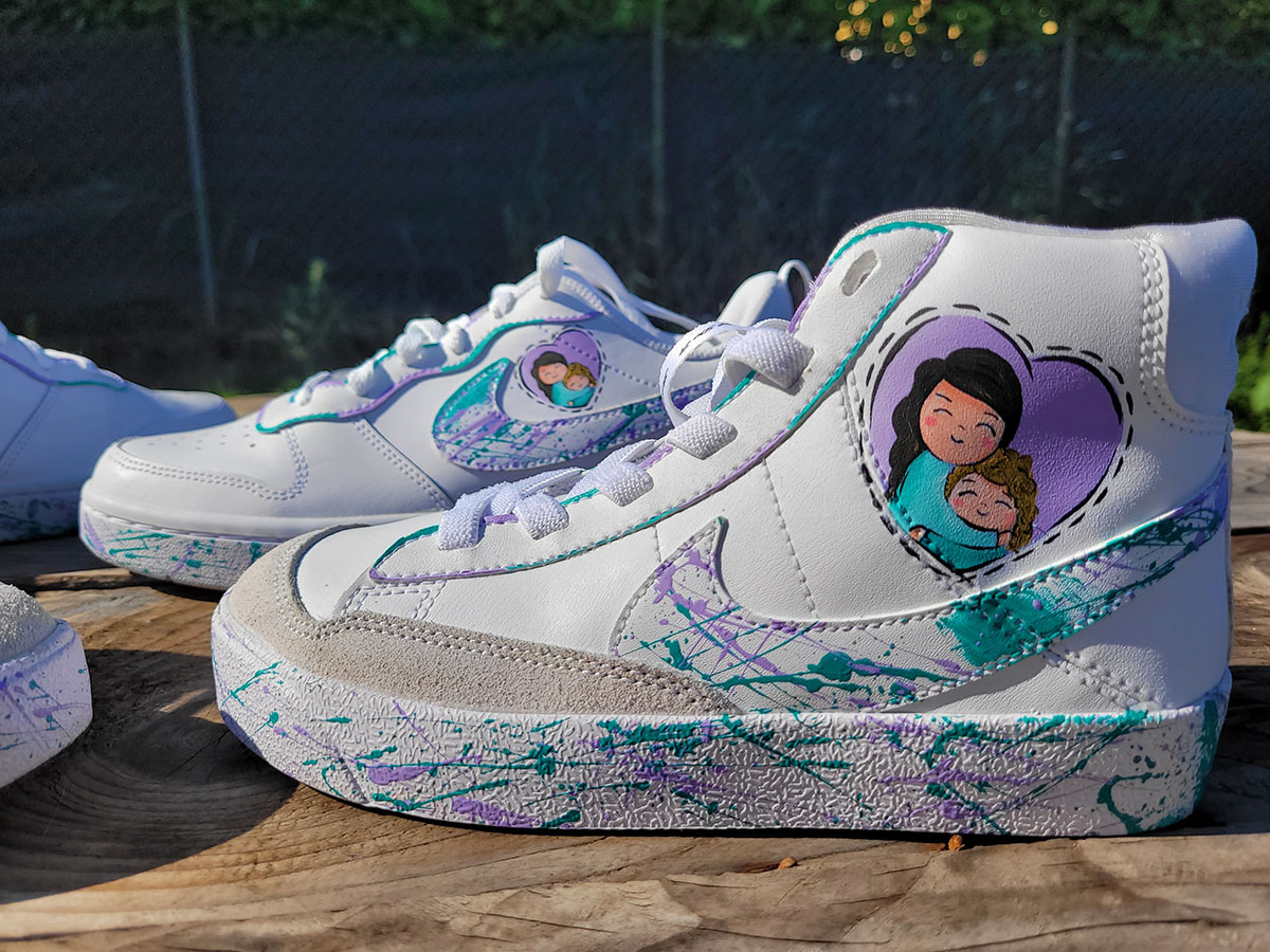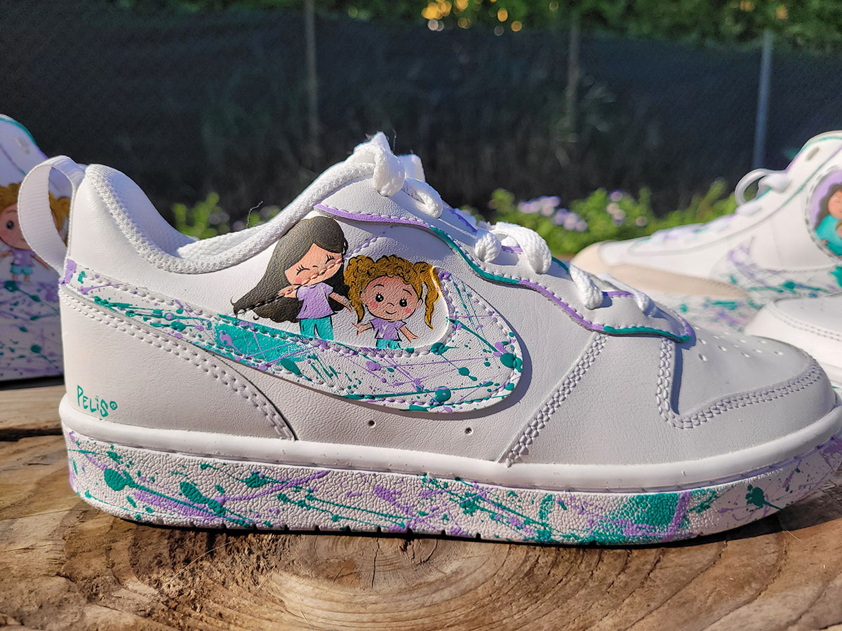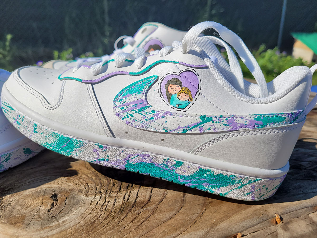 Scarpe dipinte interamente a mano con prodotti appositi per pelle e tessuto, trattate con differenti strati di protettivi che le rendono durevoli nel tempo.